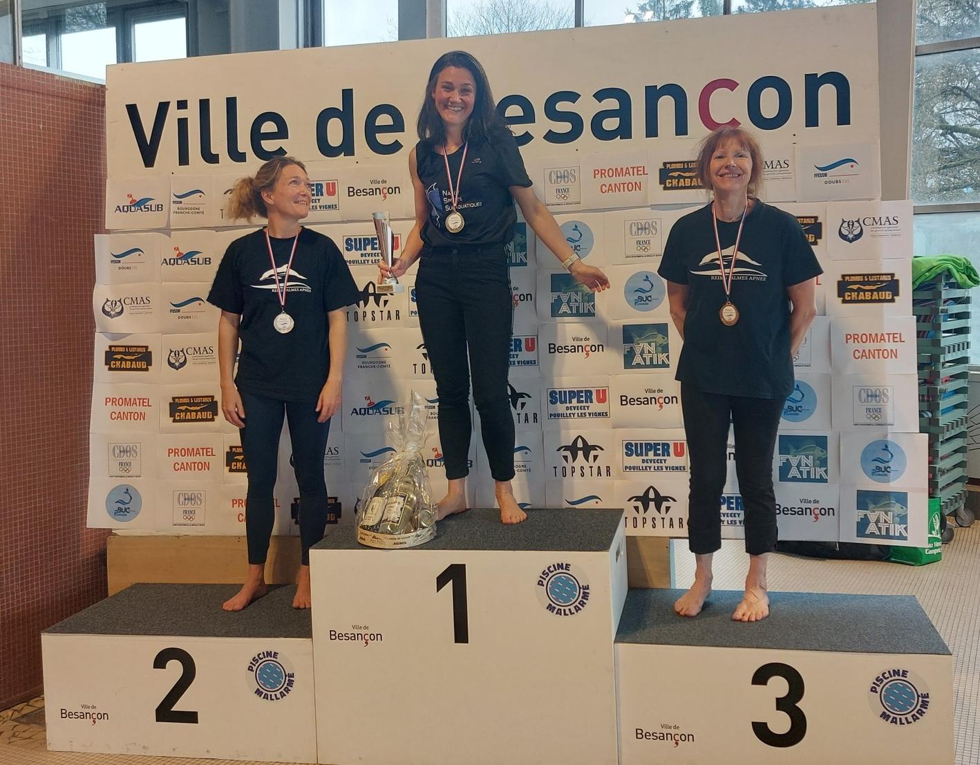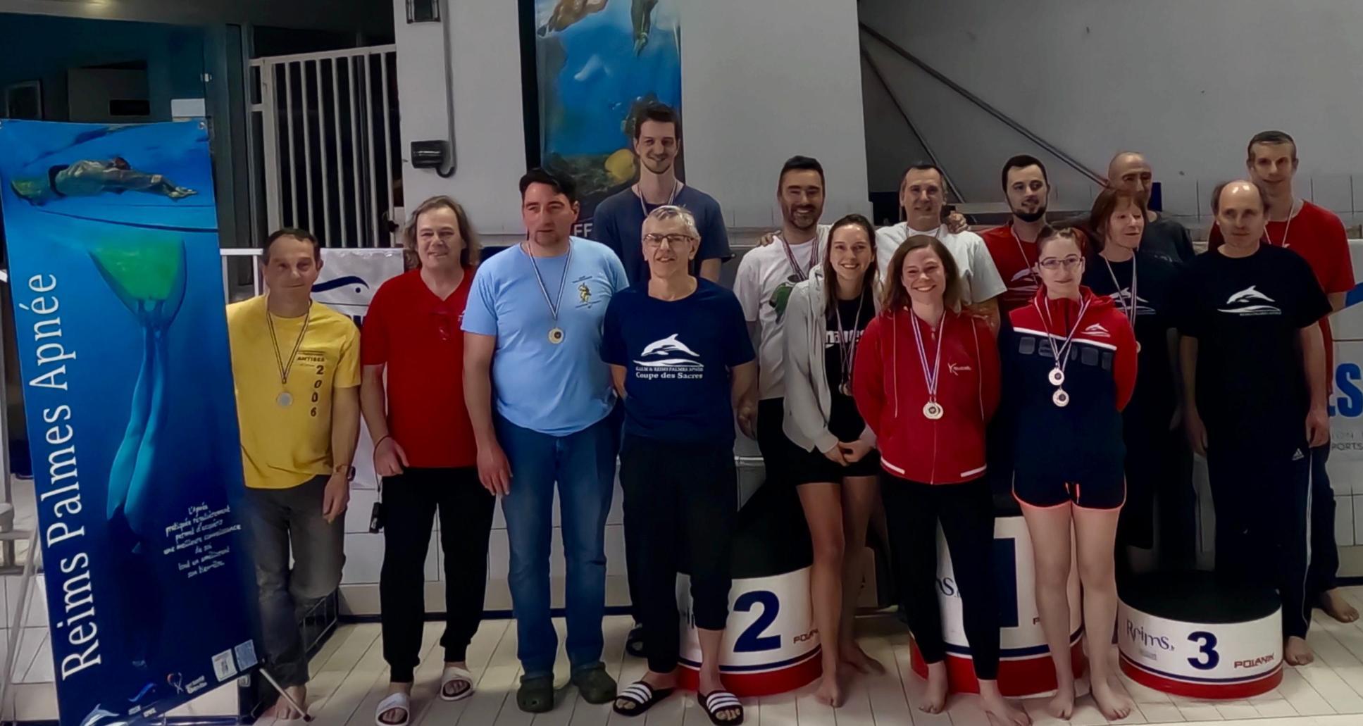 Les rémois(e)s sont allées chercher quelques médailles avec en dynamique bi palmes: Jane 150m et Martine 141.3m. Fred s'offre une belle deuxième place avec 54sec au 2X50m et enfin Martine réalise 4min52 en statique et monte sur la deuxième marche. Félicitations!